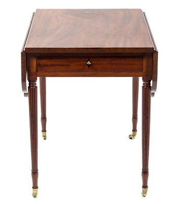having a rectangular top and two shaped leaves over a frieze drawer, raised on reeded tapering legs ending in casters, restored by Robert Whitley of Solebury, Pennsylvania.