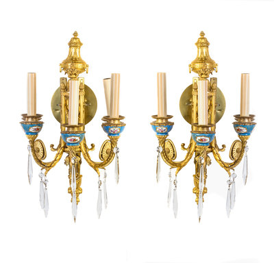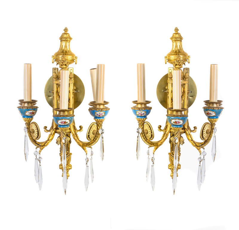 A Pair of Sevres Style Porcelain Mounted Gilt Bronze Five-Light Sconces,