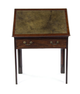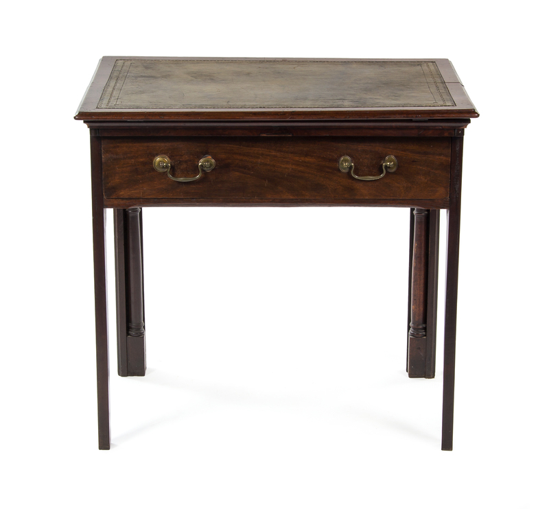 having a rectangular hinged top with a green leather writing surface above a long drawer flanked to each side by a recessed candleholder, raised on square legs.