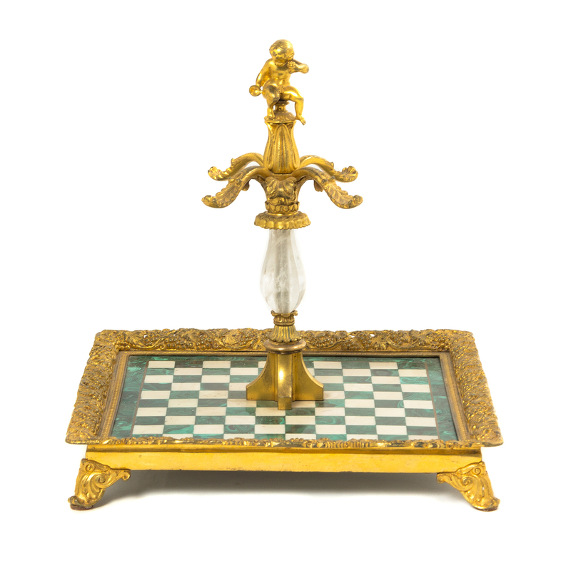 having a putto form finial over the leaf cast locking mechanism, raised on a rock crystal support over a grapevine galleried malachite base.