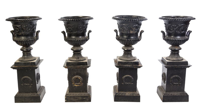 A Set of Four Victorian Style Cast Iron Urns on Stands,
