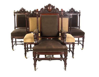 comprising one armchair and nine side chairs, each having a rectangular upholstered back and seat.