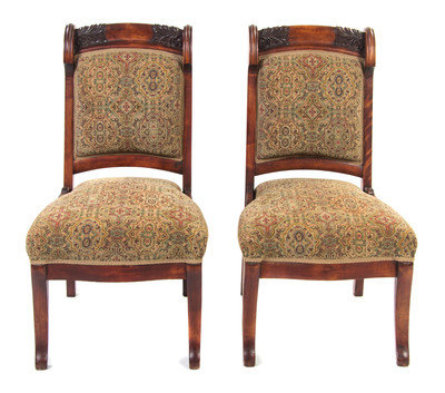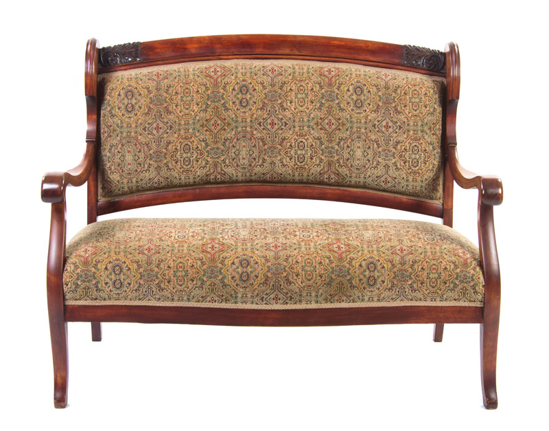 comprising a settee and two side chairs, each with a foliate carved crest rail.