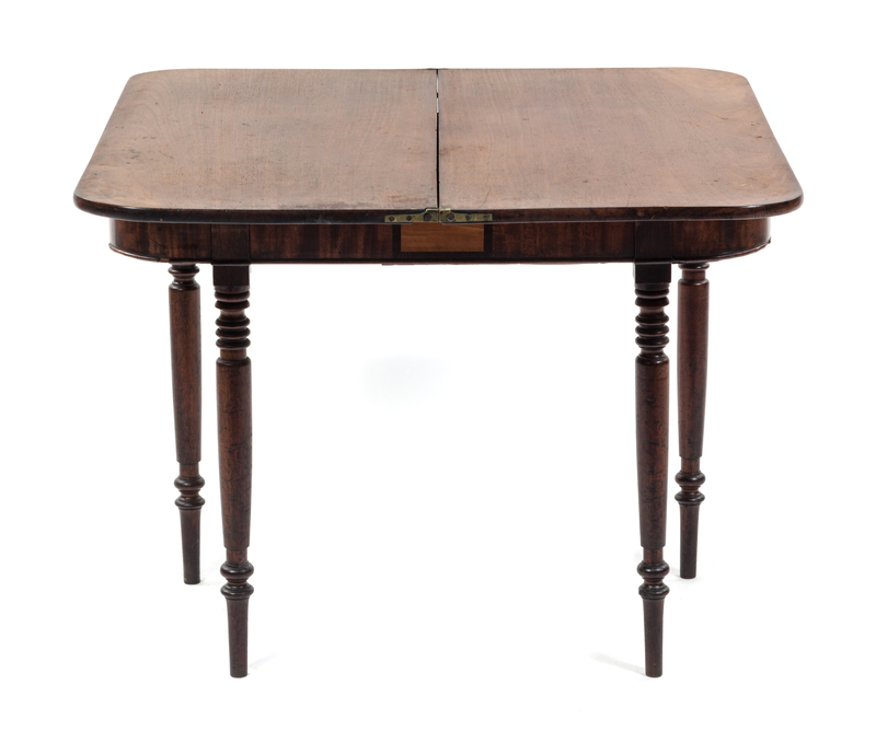 having a rectangular top with rounded corners over a D-shaped case, raised on ring turned cylindrical tapering legs.