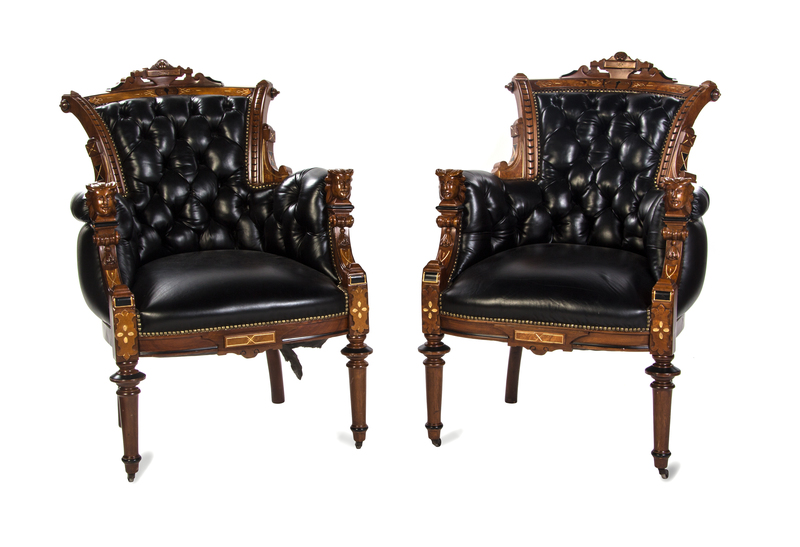 each having a shaped crest above an outwardly scrolled tufted leather back joining conforming arms with female mask handholds above a stuffover cushion seat, raised on ring-turned cylindrical tapering fore-legs ending in casters.