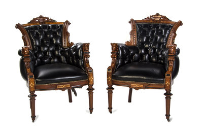 A Pair of American Victorian Gilt and Black Lacquered Burlwood Armchairs,