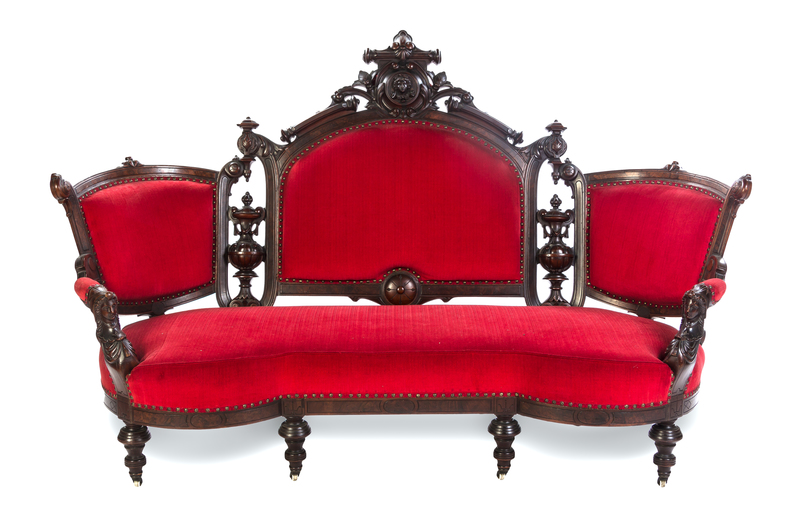 having an upholstered back, arms and seat within a frame carved with female bust, urn and foliate decoration, raised on turned tapering legs.