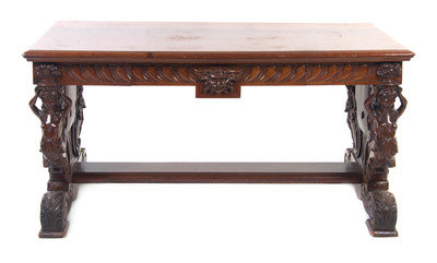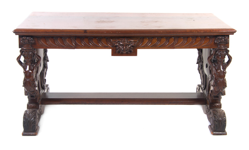 having a rectangular top over a gadrooned frieze centered with a grotesque mask, raised on twin supports carved with female caryatids and joined by a stretcher.