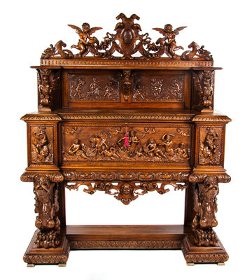 in two parts, the superstructure with a putti and shield crest above a shelf raised on griffin form supports, the base set with a relief carved drawer and raised on additional griffin form supports.
