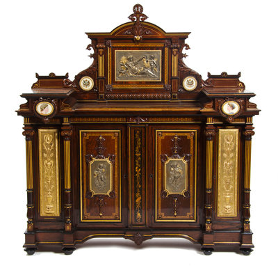 of breakfront outline surmounted by a foliate worked backsplash with a pressed brass panel depicting a maiden and a cherub, over two cupboard doors flanked by a slender cupboard to each side and fluted cylindrical pilasters, raised on flattened bun feet.