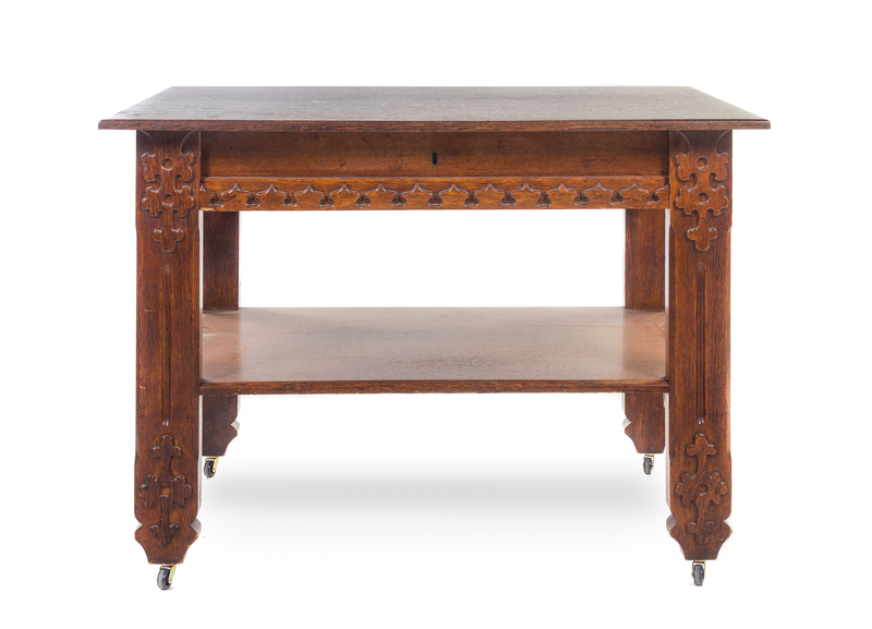 having a rectangular top above a single drawer, raised on squared legs, joined by a medial shelf, having Gothic Revival decoration throughout.