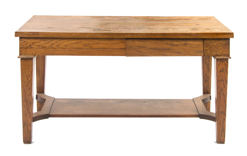 having a rectangular top over the plain frieze, set with opposing drawers, the whole raised on tapering legs joined by a medial shelf.