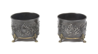 each of cylindrical footed form and decorated with a continuous band of grape vines.