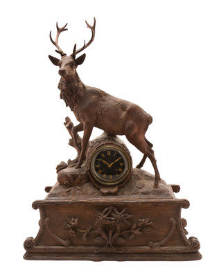 the case carved with a climbing stag over the circular dial with Roman numerals, striking on a coil and playing on a single cylinder.