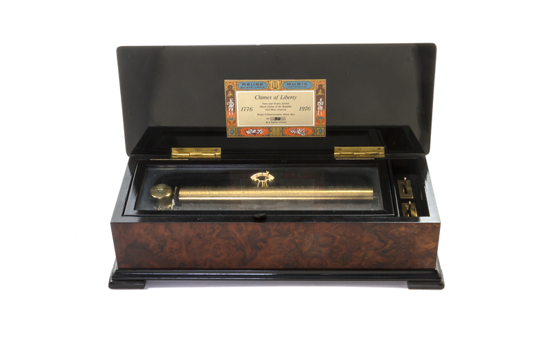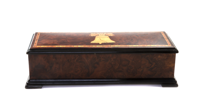 Chimes of Liberty, numbered 98 of an edition of 100, the case inlaid to show the Liberty Bell, playing 3 airs on two combs and an 8 5/8 inch cylinder.