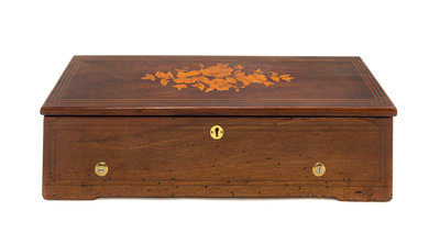 the case inlaid to show a bouquet of flowers, playing eight airs on a single 13 inch cylinder.