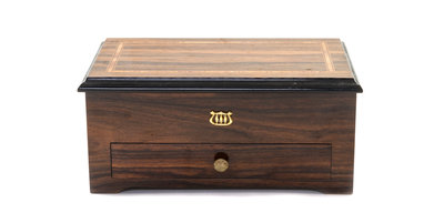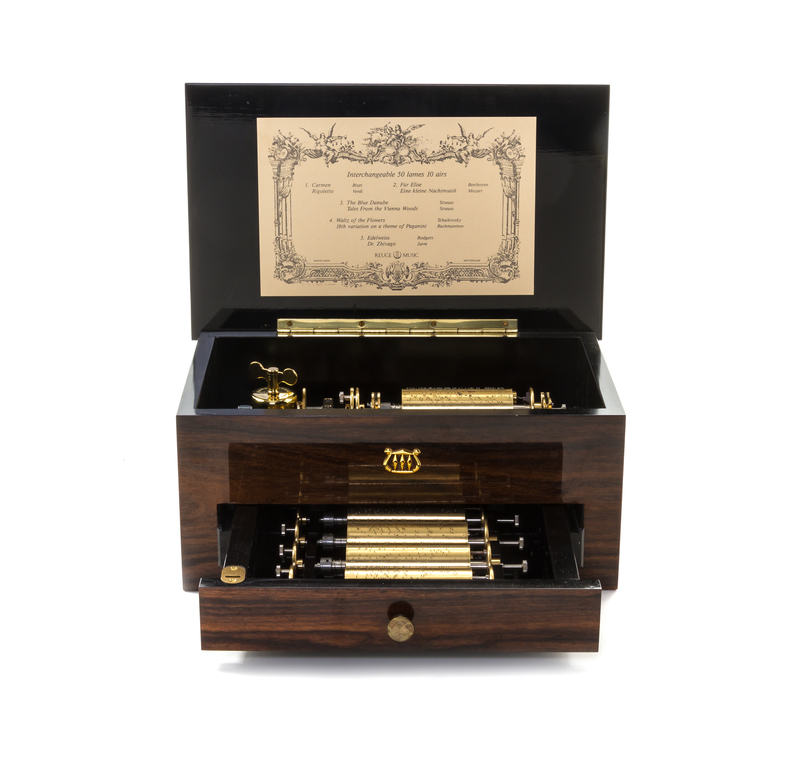 the case set with a drawer, playing 10 airs on a single 2 5/8 inch cylinder.