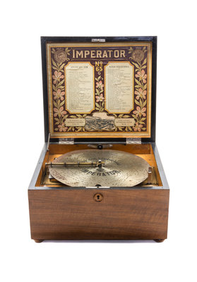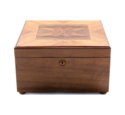 the lid having a rectangular burlwood inset, together with nine 12 inch disks.
