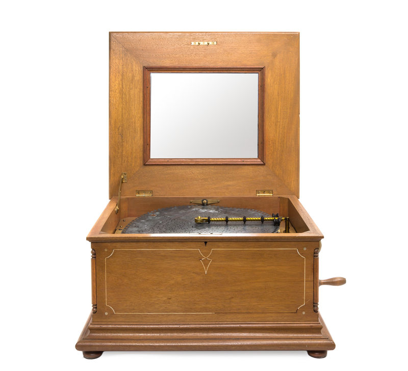 numbered 64989, the case having line inlays and bead molded edges with a mirror-inset interior, together with thirty-six 13 1/2 inch disks.