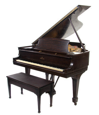 serial number 721185, in a mahogany case with matching bench.