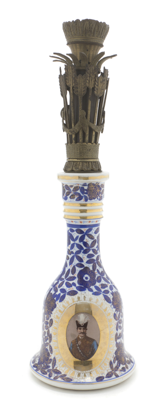 of bottle form, depicting a cartouche of Naser-al din Shah and Mozaffer al-din Shah on a field of blue foliage, surmounted by a quiver and arrow form neck, marked F&M for Fischer & Mieg.
