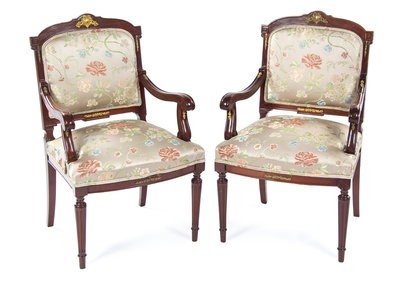 A Pair of Louis XVI Style Gilt Bronze Mounted Mahogany Fauteuils,