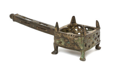 having an openwork vessel and a rectangular handle, raised on pad feet.