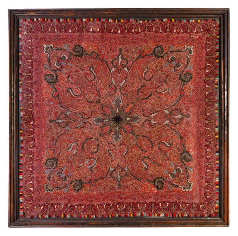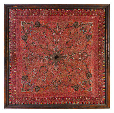 having a center medallion on an allover scrolling field within multiple borders, framed.