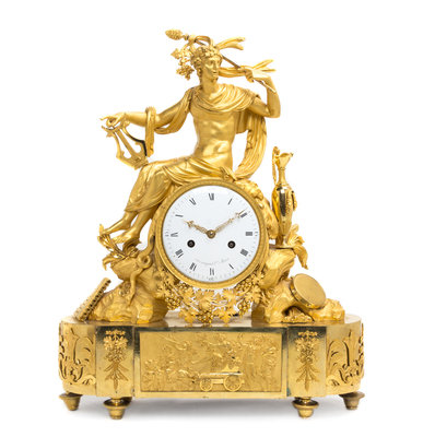 having a figure of a classical musician surmounting the circular dial with Roman hours and Arabic minutes, the base set with a frieze depicting classical figures in a chariot.