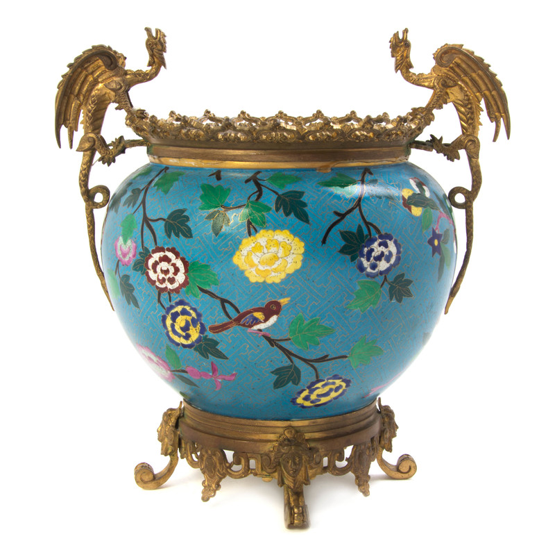 the bowl enameled to show flowers against a blue ground, the mounts cast with dragon handles and raised on four feet.