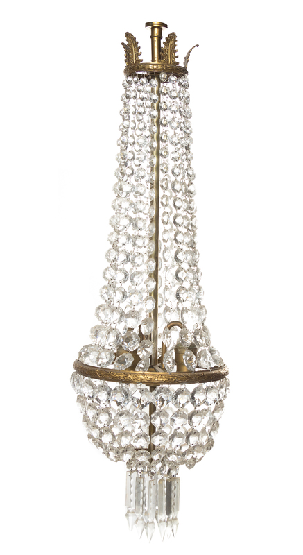 having a foliate cast corona issuing the chains of graduated octagonal prisms centered with three lighting elements.