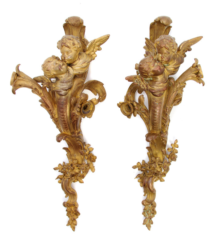 each cast as a winged putto and a girl, set on a scrolling backplate.