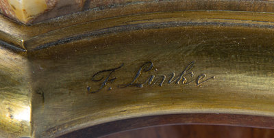 having a shaped rectangular marble inset top over a single drawer and a paneled door, raised on tapering legs ending in sabots, one bronze mount signed F. Linke.