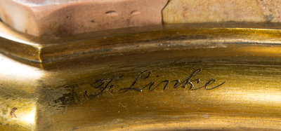 having a shaped rectangular marble top above a single drawer, raised on cabriole legs joined by a medial shelf and ending in sabots, one bronze mount signed F. Linke.