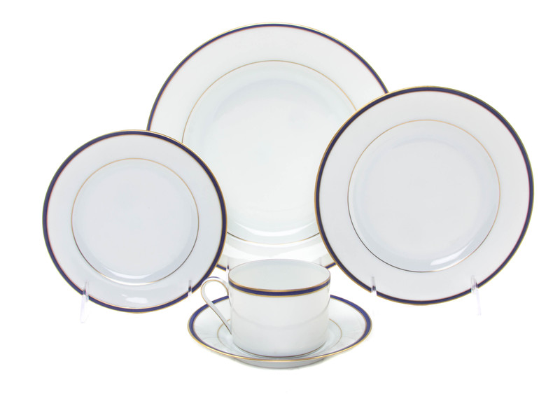 comprising thirty-two dinner plates, seventeen salad plates, seventeen bread plates, and sixteen cups and saucers, each with gilt and cobalt borders.