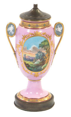 of ovoid handled form, decorated with a landscape and mounted as a lamp.