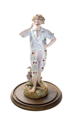 depicting a standing gentleman with dust dome and stand, together with an additional dust dome and stand.