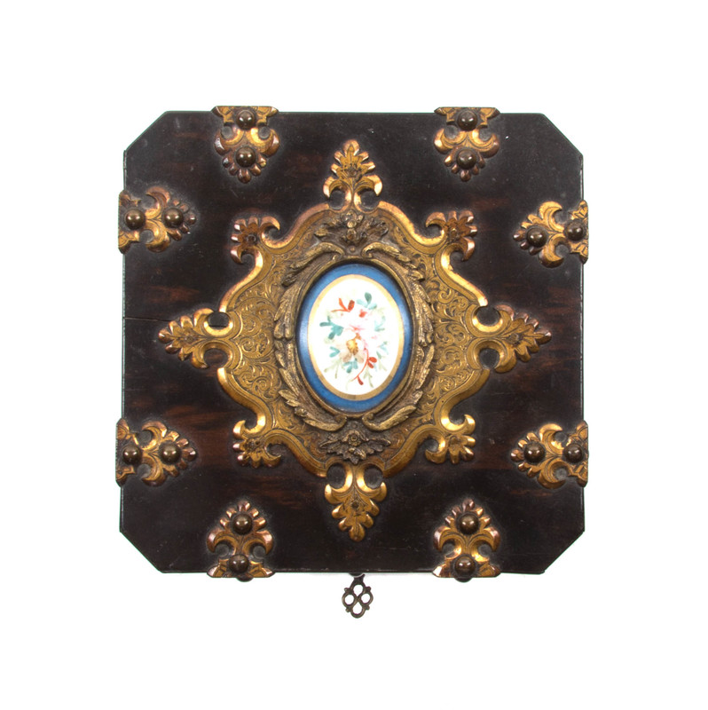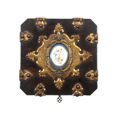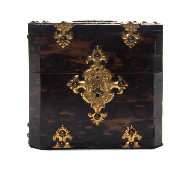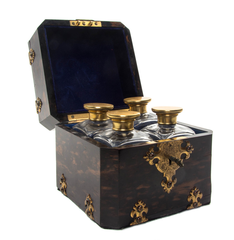 A French Brass and Porcelain Mounted Calamander Decanter Set,