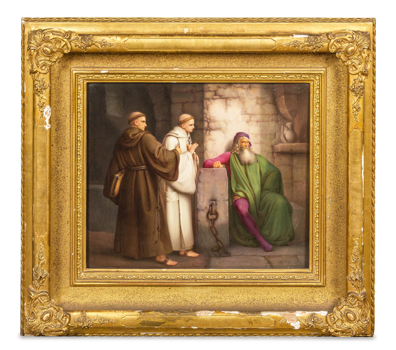 depicting a prisoner and two monks in a dungeon, signed F. Zapf in the lower right, bearing an impressed K.P.M. and scepter mark to the reverse.