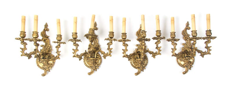 A Set of Four Louis XV Style Gilt Bronze Three-Light Sconces,