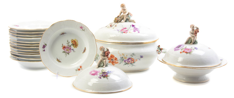 comprising a tureen, a covered entree dish, a lid and twelve soup bowls, each with scepter and orb mark.