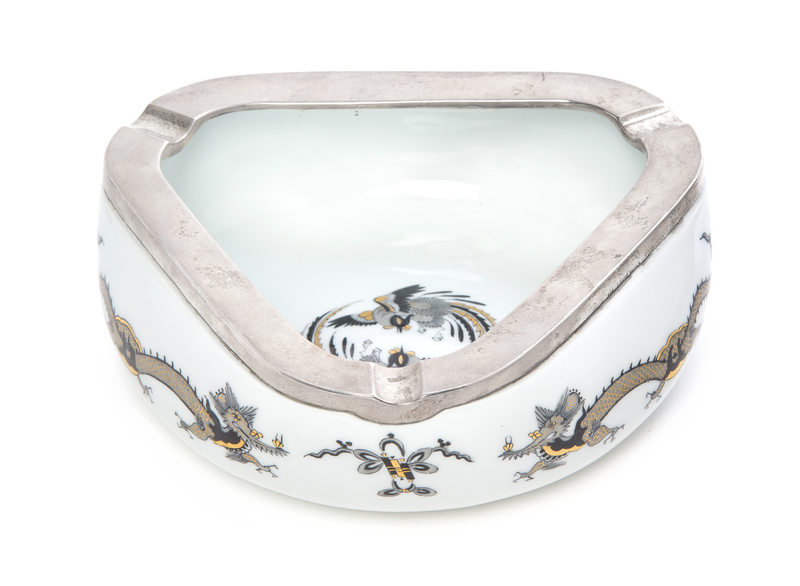 of triangular form with a silvered metal rim, having crossed swords mark in underglaze blue.