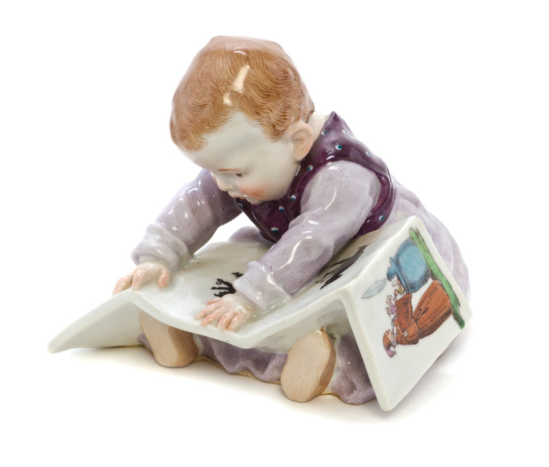 depicting a seated boy reading a picture book, having crossed swords in underglaze blue, incised U149 and impressed 85.