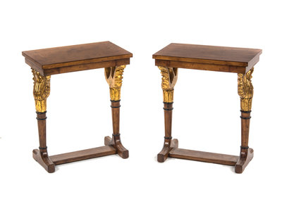 each having a rectangular top above carved eagles and cylindrical supports joined by an H-form stretcher.