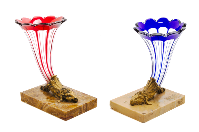 one in red cut to clear glass with an onyx base, the other in cobalt cut to clear glass with a marble base, both issuing from a ram mask.
