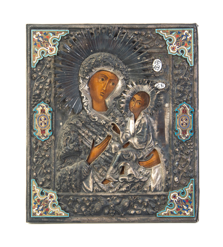 depicting Mother and Child with a silvered and enameled oklad, apparently unmarked.