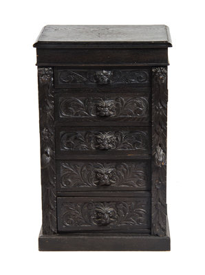 each drawer front carved to show foliate scrolls and a grotesque mask.