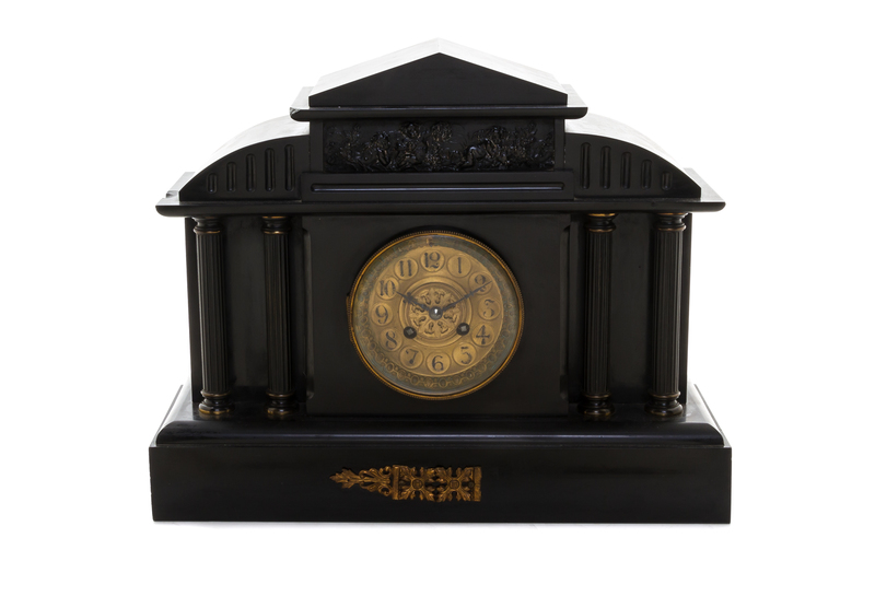 of architectural form with a circular dial having Arabic numerals flanked by pairs of columns, striking on a coil.