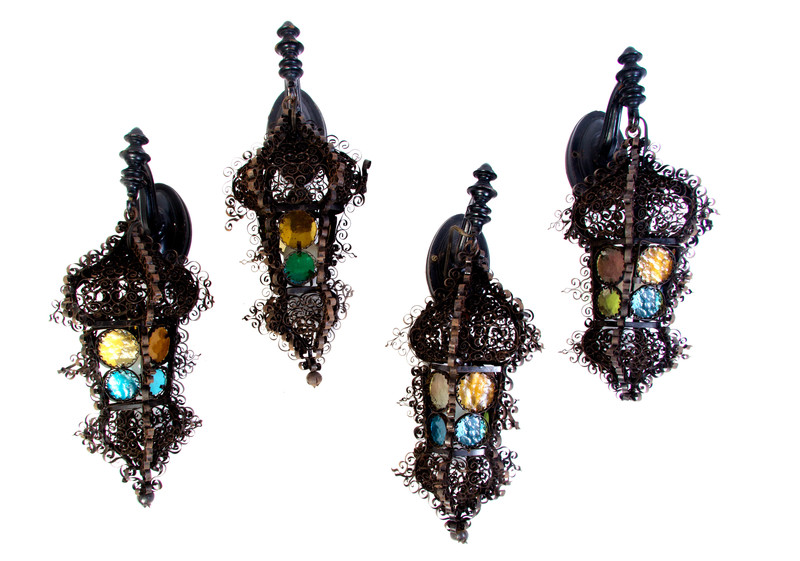 each of hexagonal form, openworked throughout to show C-scrolls and circular glass panels.