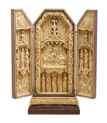 each panel carved to show saints and mounted figures beneath Gothic architectural arches, the center section with a continuous grapevine border, contained in a wood frame.